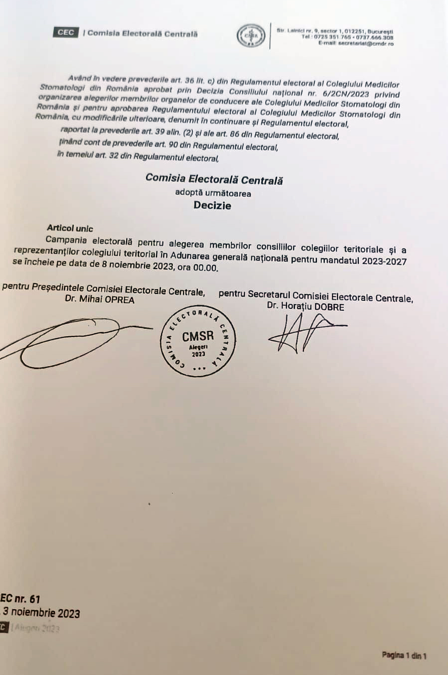 Comisia Electorala Centrala adopta urmatoarea decizie: